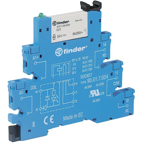 Интерфейсные модули реле 6A (тип 38.61) 386170245050: 1 перекидной контакт 6А (= 24В Чувст. пост. тока) пружинные зажимы - AgNi + Au