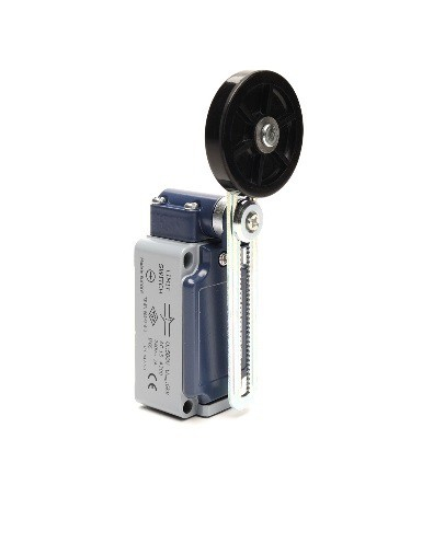 Выключатель концевой быстрого переключения угловой 2-х направленный с пластмассовой консолью и резиновым роликом d=50мм на регулируемом рычаге (1НО+1НЗ)