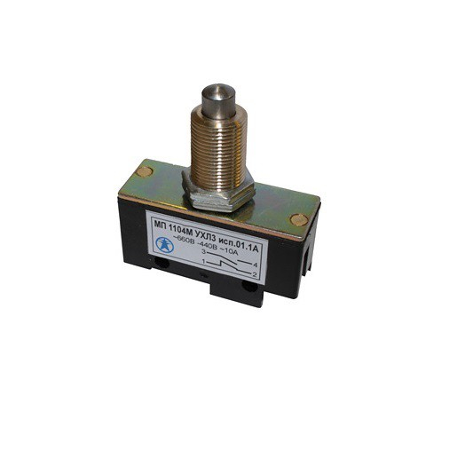 Микровыключатель МП 1104М УХЛ3 исп.01.1А, 2-х пол., 10А, 660В, 1з+1р, IP00, толкатель сферический, фронтальный гайками, винт